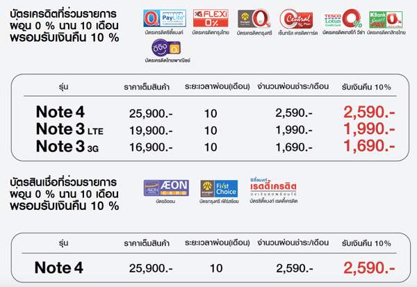 ซัมซุง มีโปรโมชั่นดีๆ มาฝากกันอีกแล้ว กับ Samsung Galaxy Note 4 โดยเมื่อซื้อ Samsung Galaxy Note 4 ราคา 25,900 บาท พร้อมผ่อน 0% นาน 10 เดือน ด้วยบัตรเครดิตที่ร่วมรายการ รับเงินคืน 10% ของราคาเครื่อง หรือได้รับเงินคืน 2,590 บาท นั่นหมายความว่า ราคา Samsung Galaxy Note 4 จะเหลือแค่ 23,310 บาทเท่านั้น