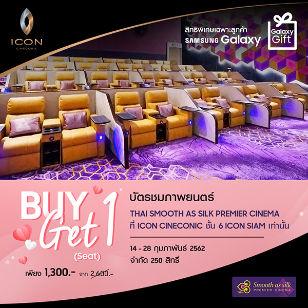 สิทธิพิเศษสำหรับลูกค้าที่ใช้สมาร์ทโฟน Samsung Galaxy (รุ่นที่วางจำหน่ายตั้งแต่ปี 2014 เป็นต้นไป) และกดรับสิทธิ์ผ่าน application Galaxy Gift รับสิทธิ์ซื้อบัตรชมภาพยนตร์ 1 ที่นั่ง พร้อมรับฟรีอีก 1 ที่นั่ง (มูลค่าสูงสุดที่นั่งละ 1,300 บาท) ที่โรงภาพยนตร์ VIP THAI Smooth as Silk PREMIER CINEMA สุดหรูหรา และบริการระดับเวิลด์คลาส ภายใต้ความสะดวกสบายจากการนั่งชมภาพยนตร์บนเก้าอี้ไอโคนิกพรีเมียร์แชร์ดีไซน์หรูที่ปรับเอนด้วยระบบไฟฟ้า พร้อมด้วยเพลทสำหรับวางอาหาร อีกทั้งยังได้รับสิทธิ์ใช้บริการวีไอพี เลานจ์ รับรองด้วยอาหาร และเครื่องดื่มหลากหลายจากร้านอาหารชื่อดัง ที่มาพร้อมการบริการเหนือระดับ และดีที่สุดเสมือนโรงแรม 6 ดาว ณ แฟล็กชิพมาสเตอร์พีซแห่งใหม่ของโลกภาพยนตร์ ไอคอน ซีเนคอนิค (ICON CINECONIC) ชั้น 7 ศูนย์การค้าไอคอนสยาม รับสิทธิ์ได้ตั้งแต่วันที่ 14 – 28 ก.พ. 2562 จำนวนจำกัด 250 สิทธิ์