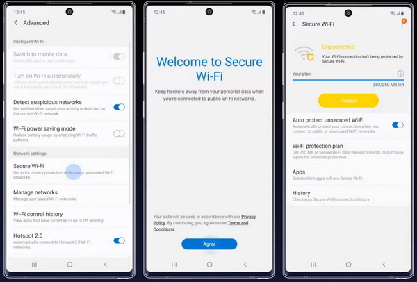 วิธีที่ซัมซุงปกป้องผู้ใช้จากภัยคุกคาม: Secure Wi-Fi[5] จะปกป้องการท่องเว็บไซต์ของคุณด้วยการเข้ารหัสการส่งข้อมูลอินเทอร์เน็ตและปิดใช้งานการติดตามแอปฯและเว็บไซต์ ซึ่งจะช่วยให้ผู้ใช้สามารถเข้าชมเว็บไซต์ต่างๆ ได้อย่างปลอดภัยผ่านการเชื่อมต่ออินเทอร์เน็ตสาธารณะโดยไม่ต้องเป็นกังวล[6]
