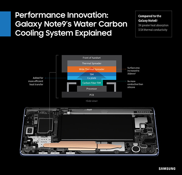 โดยทาง Samsung เอง ก็ได้กล่าวถึงเทคโนโลยีระบายความร้อนบน Samsung Galaxy Note 9 ที่มีชื่อว่า Water Carbon Cooling System หรือระบบความเย็นน้ำคาร์บอน ซึ่งจากภาพโปรโมตนั้น จะเห็นแผ่นทองแดงขนาดใหญ่ ทำให้หลาย ๆ คนเกิดคำถามว่า ภายในแผ่นทองแดงนี้ มีการบรรจุของเหลวตามชื่อเรียก Water Carbon Cooling ไว้จริงหรือไม่