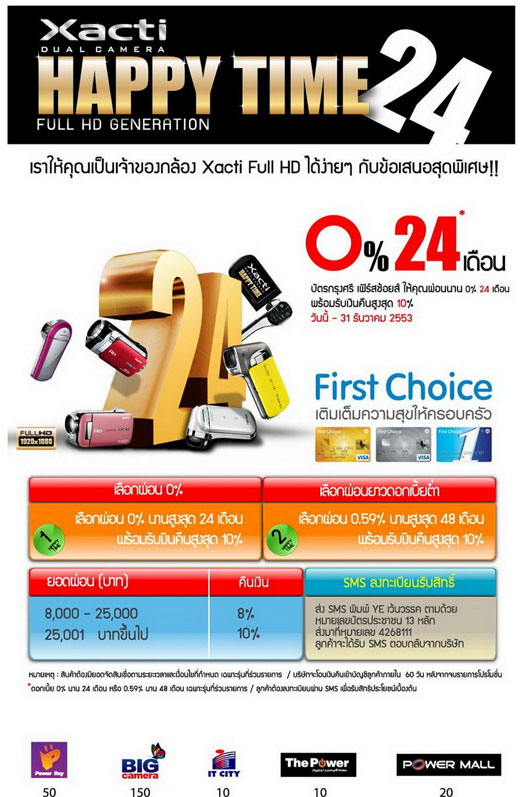 พบกับ โปรโมชั่น “Happy Time 24” กับบัตรกรุงศรี เฟิร์สชอยส์ ที่นอกจากจะผ่อนสบายๆ แล้ว ยังรับของสมนาคุณอย่างจุใจ ตั้งแต่วันนี้ – 31 ธันวาคม 2553 เท่านั้น ที่ห้างสรรพสินค้าชั้นนำและร้านค้าที่ร่วมรายการ รายละเอียดเพิ่มเติมกรุณาติดต่อศูนย์ลูกค้าสัมพันธ์ บริษัท ซันโย (ไทยแลนด์) จำกัด โทรศัพท์ 02-308-6900