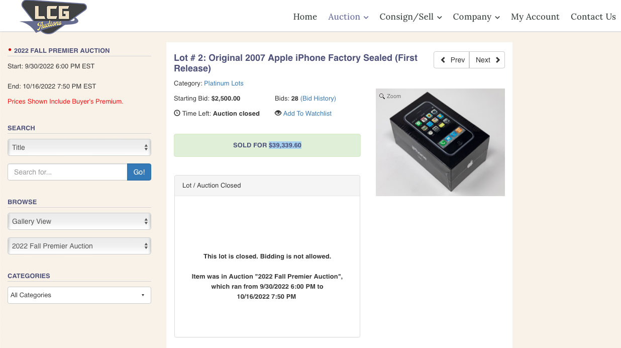 LCG Auctions เปิดประมูล iPhone รุ่นแรกที่ยังไม่ได้ถูกแกะกล่อง และเพิ่งปิดประมูลไปเมื่อวานนี้ (16 ตุลาคม 2022) พบว่า ถูกประมูลไปในราคาสูงถึง $39,339.60 หรือราว ๆ 1.5 ล้านบาทเลยทีเดียว