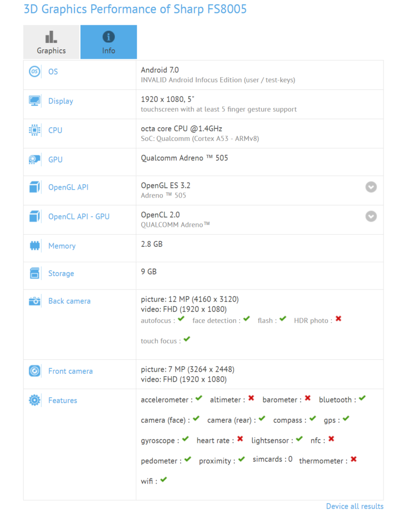 รายชื่อของสมาร์ทโฟน Sharp รุ่นปริศนาภายใต้รหัสโมเดล FS8005 ได้ไปปรากฏอยู่บนฐานข้อมูลเว็บไซต์ทดสอบประสิทธิภาพสมาร์ทโฟนและแท็ปเล็ตยอดนิยมอย่าง GFXBench ที่เผยให้เห็นรายละเอียดของสมาร์ทโฟนรุ่นใหม่บางส่วน ซึ่งหากพิจารณาจากสเปกแล้วคาดว่าเป็นมือถือระดับกลางหรือรองท็อป แต่สิ่งที่ทำให้มือถือรุ่นนี้มีความพิเศษคือ การใช้งานระบบปฏิบัติการ Android 7.0 Nougat รุ่นใหม่ล่าสุดตั้งแต่แกะออกจากกล่องด้วย สำหรับรายละเอียดของ Sharp FS8005 มีดังต่อไปนี้