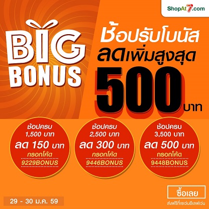 Shopat7.com แจกโบนัสใหญ่ เอาใจนักช้อป รับทันทีส่วนลด 150 บาท เมื่อช้อปขั้นต่ำ 1,500 บาท ส่วนลด 300 บาท เมื่อช้อปขั้นต่ำ 2,500 บาท และส่วนลด 500 บาท เมื่อช้อปขั้นต่ำ 3,500 บาท เฉพาะสินค้าที่ร่วมรายการ ยิ่งช้อปมาก ยิ่งลดมาก ด่วน วันที่ 28-29 มกราคม 2559 นี้เท่านั้น บริการจัดส่งฟรีที่เซเว่นอีเลฟเว่นทุกสาขา