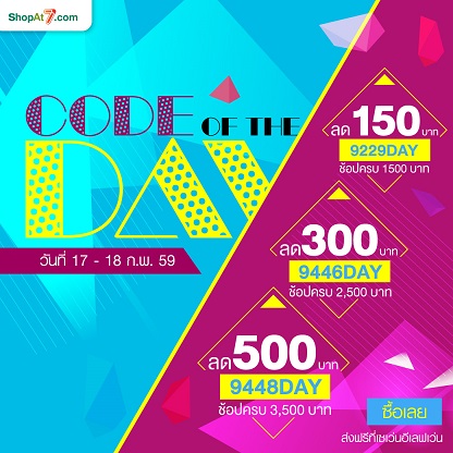 Shopat7.com คืนกำไรให้นักช้อป แจกไม่อั้น คูปองส่วนลด 150 บาท เมื่อช้อปขั้นต่ำ 1,500 บาท ส่วนลด 300 บาท เมื่อช้อปขั้นต่ำ 2,500 บาท และส่วนลด 500 บาท เมื่อช้อปขั้นต่ำ 3,500 บาท เฉพาะสินค้าที่ร่วมรายการ ตั้งแต่วันที่ 17-18 กุมภาพันธ์ 59 นี้เท่านั้น ห้ามพลาด บริการจัดส่งฟรีที่เซเว่นอีเลฟเว่นทุกสาขา