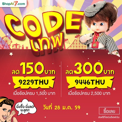Shopat7.com แจกโค้ดเทพ ใส่ปุ้บรับส่วนลดทันที 150 บาท เมื่อช้อปขั้นต่ำ 1,500 บาท และส่วนลด 300 บาท เมื่อช้อปขั้นต่ำ 2,500 บาท เฉพาะสินค้าที่ร่วมรายการ โค้ดสำหรับวันที่ 28 มกราคม 2559 เท่านั้น ห้ามพลาด บริการจัดส่งฟรีที่เซเว่นอีเลฟเว่นทุกสาขา