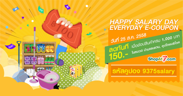 Shopat7.com จัดโปรฯ Happy Salary Day ต้อนรับเงินเดือนออก แจกคูปองส่วนลดสุดคุ้ม 150 บาท เมื่อช้อปขั้นต่ำ 1,000 บาท สินค้าบ้านและสวน อุปโภคบริโภค เอาใจขาช้อปแบบจัดเต็ม ด่วน เฉพาะวันที่ 25 สิงหาคม 58 เท่านั้น บริการจัดส่งฟรีที่เซเว่นอีเลฟเว่นทุกสาขา