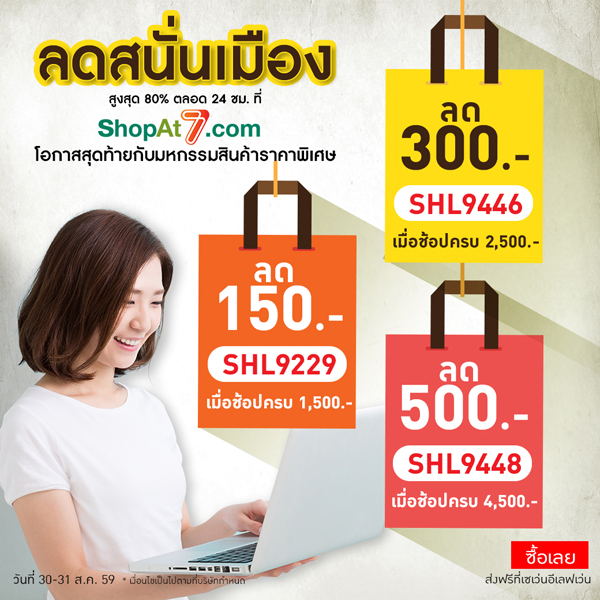 Shopat7.com ฉลองเงินเดือนออก จัดเต็มกับมหกรรมสินค้าราคาพิเศษ ส่วนลดสูงสุด 80% พร้อมโค้ดลดสนั่นเมือง รับส่วนลดทันที 150 บาท เมื่อช้อปขั้นต่ำ 1,500 บาท ส่วนลด 300 บาท เมื่อช้อปขั้นต่ำ 2,500 บาท และส่วนลด 500 บาท เมื่อช้อปขั้นต่ำ 4,500 บาท ยิ่งช้อปมาก ยิ่งลดมาก ด่วน เฉพาะวันที่ 30-31 สิงหาคม 2559 นี้เท่านั้น บริการจัดส่งฟรีที่เซเว่นอีเลฟเว่นทุกสาขา
