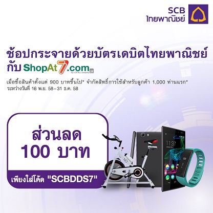 Shopat7.com มอบสิทธิพิเศษสำหรับผู้ถือบัตรเดบิตไทยพาณิชย์ ช้อปออนไลน์วันนี้ รับส่วนลดเต็มๆ 100 บาท เพียงใส่โค้ด SCBDDS7 เมื่อซื้อสินค้าตั้งแต่ 900 บาทขึ้นไป ด่วน จำกัดสิทธิ์การใช้สำหรับลูกค้า 1,000 ท่านแรก วันนี้ ถึง 31 ธันวาคม 2558