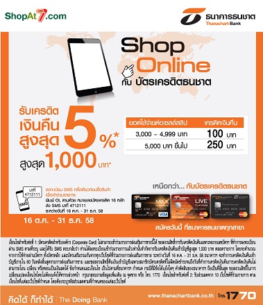 shopat7.com มอบสิทธิพิเศษสำหรับผู้ถือบัตรเครดิตธนชาต ช้อปออนไลน์วันนี้ รับเครดิตเงินคืน 100 บาท 250 บาท สูงสุด 1,000 บาท เมื่อมียอดใช้จ่ายต่อเซลล์สลิปตามที่กำหนด ง่ายๆ เพียงลงทะเบียน SMS ครั้งเดียวก่อนซื้อสินค้า เพื่อเข้าร่วมรายการ วันนี้ – 31 ธันวาคม 2558