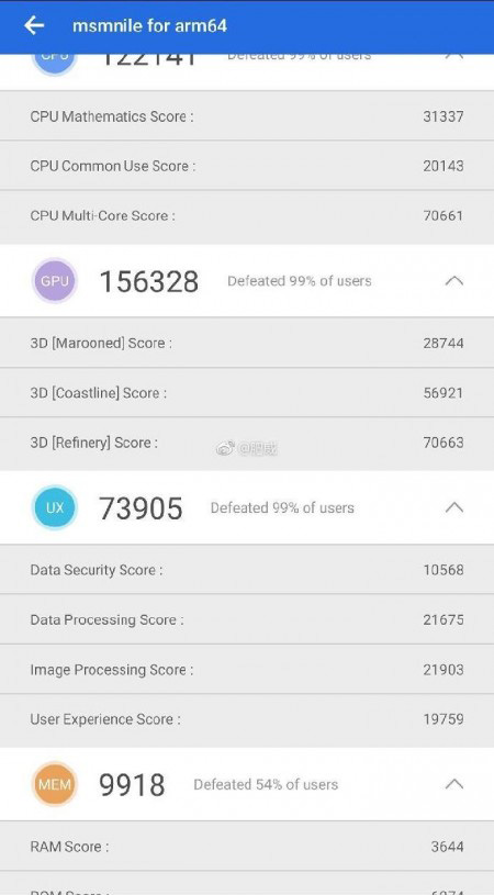 โดยผลการทดสอบดังกล่าว ถูกโพสต์บนเว็บไซต์ Weibo กับการทดสอบชิปเซ็ต Snapdragon 8150 ด้วยโปรแกรม AnTuTu พบว่า ทำคะแนนทดสอบได้ถึง 362,292 คะแนน เหนือกว่าชิปเซ็ต Kirin 980 จาก Huawei ที่ทำได้ 273,913 คะแนน รวมถึง Apple A12 Bionic (353,210 คะแนน) แต่คะแนนห่างกันแค่เล็กน้อยเท่านั้น