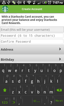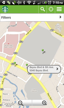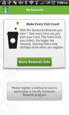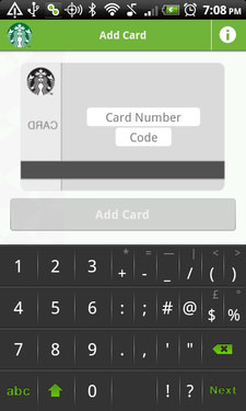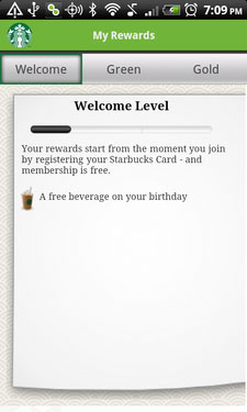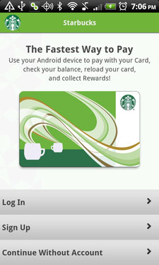 Starbucks App มีให้ดาวน์โหลดแล้วบน Android Market ครับ ซึ่งสมาชิกร้านสตาร์บั๊ค (ที่อเมริกา) สามารถกรอกเลขบัตรสมาชิก (1 ใบต่อ 1 เครื่อง) เพื่อเช็คยอดการซื้อที่ผ่านมา, เช็คยอดเงินที่เหลือบนบัตร และสามารถเพิ่มเงินเข้าไปในบัตรได้ด้วยครับ