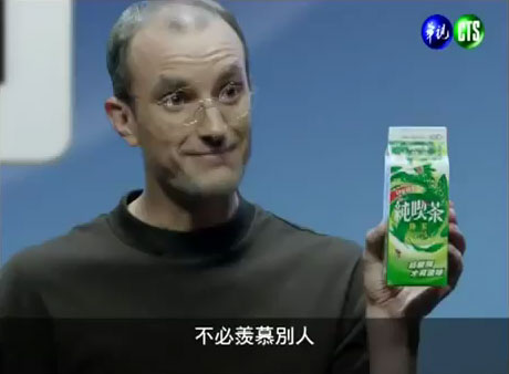 [11-กรกฏาคม-2554] อย่าเพิ่งตกใจว่า ท่านศาสดาของใครหลายๆ คนอย่าง Steve Jobs จะเลิกผลิต ไอแพด (iPad) , ไอโฟน (iPhone) แล้วหันมาทำธุรกิจส่วนตัวที่ไต้หวันจริงๆ นะครับ เพราะบริษัทผลิตชาชื่อดังของประเทศไต้หวัน ได้ทำคลิปโฆษณาและแต่งตัวเลียนแบบ Steve Jobs ครับ โดยเน้นลักษณะเฉพาะของ Steve Jobs ก็คือ ใส่เสื้อคอเต่าสีดำ และกางเกงยีนส์ตัวโปรด เปลี่ยนจากถือเครื่อง iPad 2 มาถือขวดชาครับ จริงๆ แล้วคอนเซปท์ของคลิปโฆษณาชุดนี้คือ ส่งผลิตภัณฑ์ลุ้นรับ iPad 2 นั่นเอง (คุ้นๆ ว่าชายี่ห้อนี้จะมีขายที่เมืองไทยด้วยหรือเปล่า เหมือนเคยเห็นครับ แต่จำยี่ห้อไม่ได้)