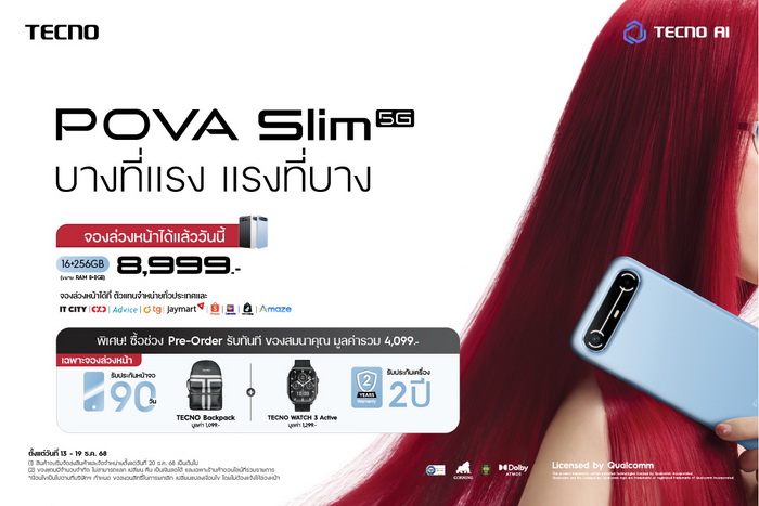 TECNO POVA SLIM จะเริ่มวางจำหน่ายอย่างเป็นทางการตั้งแต่วันที่ 20 ธันวาคม 2568 เป็นต้นไป ที่ร้าน IT CITY, TG Advice และ Jaymart ทุกสาขาทั่วประเทศ รวมถึงช่องทางออนไลน์ TikTok Shopee Lazada และ Amze