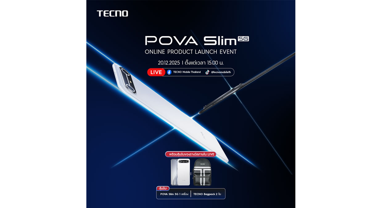 แฟน ๆ TECNO ยังสามารถร่วมเป็นส่วนหนึ่งของงานเปิดตัวออนไลน์ผ่านช่องทาง Facebook และ TikTok: TECNO Mobile TH ในวันที่ 20 ธันวาคม 2568 เวลา 15.00 น. เป็นต้นไป ภายในไลฟ์จะได้พบกับแขกรับเชิญพิเศษ ที่จะมาร่วมเจาะลึกดีไซน์อันโดดเด่นของ POVA SLIM แบบทุกมิติพร้อมเติมความสนุกและสีสันตลอดการไลฟ์และยังมีไฮไลท์สุดพิเศษที่ทุกคนรอคอยกับกิจกรรมลุ้นรับ TECNO POVA SLIM จำนวน 1 เครื่อง และของรางวัลอีกมากมายสำหรับผู้โชคดีภายในไลฟ์เท่านั้น