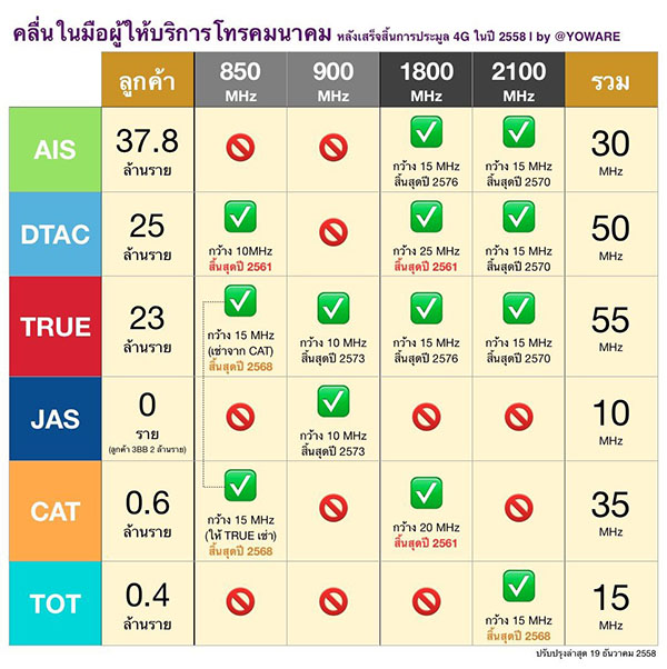 ตารางสรุปการถือครองคลื่นของเอกชนในประเทศไทย โดยคุณ @yoware ล่าสุดคลื่น 900MHz ของ JAS ตกไปอยู่ในมือของ AIS เรียบร้อยแล้ว