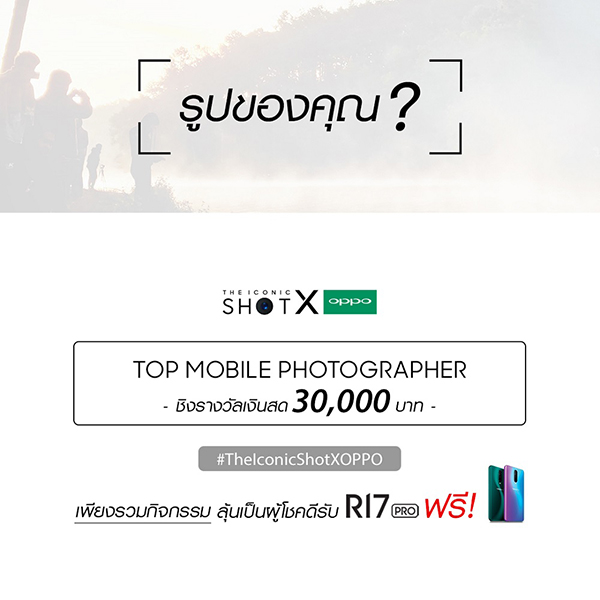 ภายใต้คอนเซ็ปต์ “ THE ICONIC SHOT ” เพียงใช้สมาร์ทโฟน OPPO รุ่นใดก็ได้ ถ่ายภาพที่สวยที่สุด ก็มีสิทธิชิงรางวัลเงินสด และของรางวัลอื่นๆมูลค่ารวมกว่า 200,000 บาท