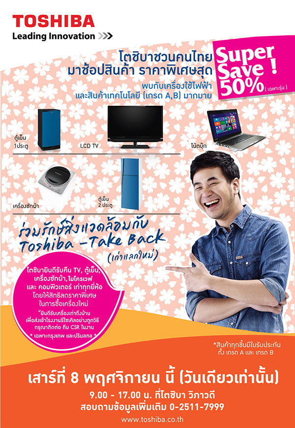 โตชิบา ชวนคุณมาช็อปส่งท้ายปลายปี กับเครื่องใช้ไฟฟ้าภายในบ้าน และสินค้าเทคโนโลยี ในราคาพิเศษ ทั้งเกรด A เกรด B มากมายในงาน ‘โตชิบา Super Save 2014’ พบกับส่วนลดสุดพิเศษกว่า 70% สำหรับสินค้าเกรดB และส่วนลดสูงสุดกว่า 50% สำหรับสินค้าเกรดA ไม่ว่าจะเป็นเครื่องใช้ไฟฟ้าภายในบ้านชิ้นเล็ก อาทิเช่น พัดลม เครื่องฟอกอากาศ เครื่องทำน้ำอุ่น เครื่องใช้ไฟฟ้าในครัว-หม้อหุงข้าว กระติกน้ำร้อน กระทะไฟฟ้า เตาอบไมโครเวฟ และสินค้าชิ้นใหญ่อย่าง ตู้เย็นและเครื่องซักผ้า รวมถึงสินค้าโน้ตบุ๊ก และอุปกรณ์ไอทีมากมายหลากหลายรุ่น พร้อมโปรเจกพิเศษ Toshiba – Take Back รับคืนเครื่องเก่า แลกรับส่วนลดสุดพิเศษ เพื่อนำไปรีไซเคิลอย่างถูกวิธี ในวันเสาร์ที่ 8 พฤศจิกายน 2557 9.00-17.00 น. ที่โตชิบา วิภาวดี แค่วันเดียวเท่านั้น! สอบถามข้อมูลเพิ่มเติม 02 511 7999 หรือ www.toshiba.co.th