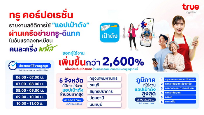ทรู คอร์ปอเรชั่น รายงานข้อมูลสถิติการใช้งานแอปพลิเคชัน “เป๋าตัง” ของลูกค้าทรูและดีแทคในวันแรกของการลงทะเบียนโครงการ “คนละครึ่งพลัส” (ระหว่างเวลา 06.00–22.00 น.) พบว่าปริมาณผู้ใช้งานเพิ่มขึ้นมากกว่า 2,600% เมื่อเทียบกับช่วงเวลาปกติ สะท้อนกระแสตอบรับอย่างล้นหลามจากประชาชนทั่วประเทศที่เข้าร่วมลงทะเบียนพร้อมกันในวันแรก พร้อมจัดตั้งวอร์รูม (Warroom) ที่ BIC ศูนย์ปฏิบัติการเครือข่ายอัจฉริยะ พร้อม AI เพื่อดูแลและบริหารเครือข่ายตลอด 24 ชั่วโมงเพื่อให้ลูกค้าทรูและดีแทคมั่นใจได้เต็มที่