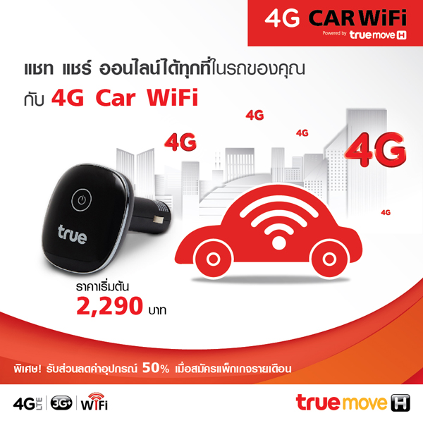 4G Car WiFi เป็นอุปกรณ์เปลี่ยนสัญญาณ 4G ให้เป็น WiFi ฮอตสปอต สำหรับใช้งานบนรถ รองรับการใช้งานบนเครือข่ายทรูมูฟ เอชเท่านั้น รองรับความถี่ 4G: Cat 4 LTE-FDD 1800/2100 MHz รองรับ 3G: UMTS 850/2100 MHz 4G ดาวน์โหลดสูงสุด 150 Mbps / อัพโหลดสูงสุด 50 Mbps 3G ดาวน์โหลดสูงสุด 21.6 Mbps / อัพโหลดสูงสุด 5.76 Mbps รองรับ WiFi 802.11 b/g/n, 2.4 GHz ใช้ไฟ 12V จากที่จุดบุหรี่ในรถ และ USB port 5V/1A สำหรับชาร์จไฟ มี 2 รุ่น คือ แชร์การใช้งานได้สูงสุด 5 อุปกรณ์ และ 10 อุปกรณ์ ในราคา 2,290 บาท และ 2,790 บาท ตามลำดับ