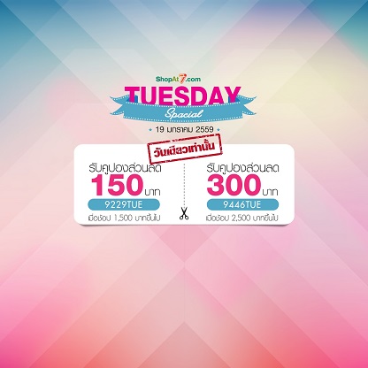 Tuesday Special ชวนคุณมาช้อปที่ Shopat7.com พร้อมรับคูปองส่วนลดสุดคุ้ม 150 บาท เมื่อช้อปขั้นต่ำ 1,500 บาท และส่วนลด 300 บาท เมื่อช้อปขั้นต่ำ 2,500 บาท ด่วน คูปองมีจำนวนจำกัด เฉพาะวันที่ 19 มกราคม 2559 เท่านั้น บริการจัดส่งฟรีที่เซเว่นอีเลฟเว่นทุกสาขา