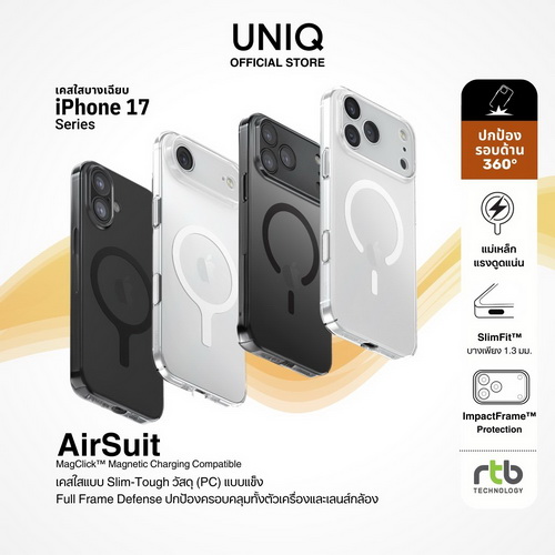 1. UNIQ AirSuit (รองรับวงแหวน MagClick™) ที่สุดแห่งความบางเฉียบ เคสใสแบบ Slim-Tough ที่ออกแบบให้แนบสนิทไปกับตัวเครื่อง ให้สัมผัสเสมือนไม่ได้ใส่เคส แต่ยังคงมอบการปกป้องได้อย่างมั่นใจ มาพร้อมดีไซน์ SlimFit™ ที่บางเฉียบเพียง 1.3 มม. ผสานเทคโนโลยี ScratchGuard™ ช่วยป้องกันรอยขีดข่วนทั้งด้านหลังและรอบตัวเครื่องได้อย่างแข็งแกร่ง เคลือบสาร Anti-Yellowing ป้องกันการเปลี่ยนสี เพื่อคงความใสของตัวเคสให้ยาวนานยิ่งขึ้น พร้อมระบบป้องกัน ImpactFrame™ ที่ออกแบบมาให้รองรับโมดูลกล้องใหม่แบบ Camera Bar ช่วยปกป้องรอบเลนส์กล้องได้อย่างสมบูรณ์แบบ ขณะที่ดีไซน์ครอบปุ่ม Camera Control ช่วยป้องกันรอยขีดข่วนบริเวณปุ่มควบคุมกล้อง โดยที่คุณยังสามารถใช้งานกล้องได้อย่างราบรื่นไม่มีสะดุด วางจำหน่ายในราคา 890 บาท