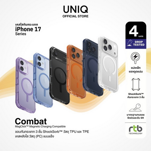 3. UNIQ Combat (รองรับวงแหวน MagClick™) ที่สุดแห่งการปกป้องขั้นสุด เคสใสแบบไฮบริดที่ขึ้นชื่อเรื่องความแข็งแกร่ง มาพร้อมขอบกันกระแทกที่ปกป้องอย่างแน่นหนาถึง 3 ชั้น ผสานเทคโนโลยี ShockSorb™ with Triple-Tier Protection ช่วยดูดซับแรงกระแทกได้อย่างเต็มประสิทธิภาพรอบด้าน รวมถึงบริเวณด้านข้างและมุมทั้ง 4 ด้าน เพื่อมอบการปกป้องที่สมบูรณ์แบบในทุกการใช้งาน พร้อมมาตรฐานความทนทานต่อรอยขีดข่วนระดับ 5H สามารถรองรับแรงกระแทกจากการตกจากที่สูงได้ถึง 4 เมตร (13 ฟุต) วางจำหน่ายในราคา 1,190 บาท