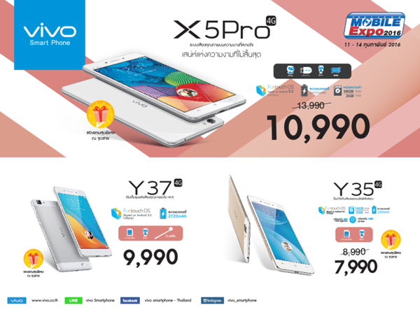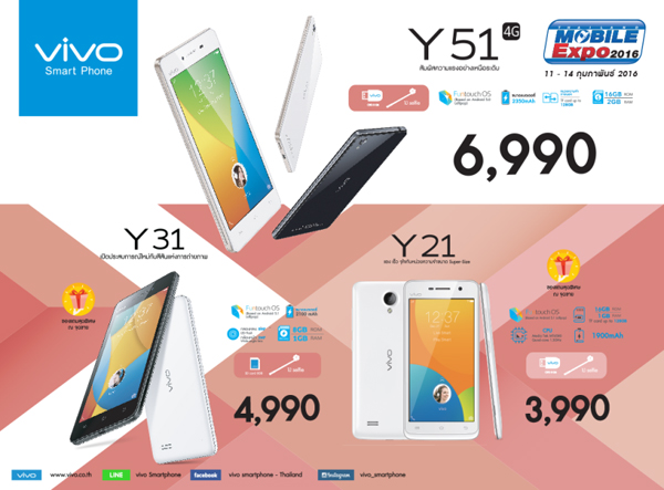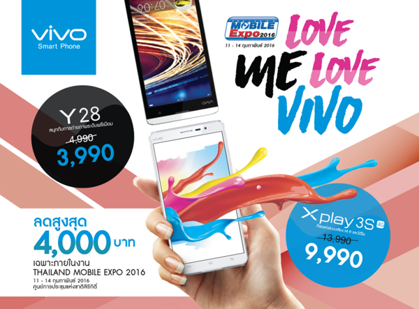 vivo กลับมาอีกครั้ง ในงาน Thailand Mobile Expo 2016 จัดเต็มไปกับธีมเดือนแห่งความรัก Love Me Love vivo ให้คุณได้สัมผัสมุมมองใหม่จากการใช้สมาร์ทโฟน ก้าวล้ำนำเทรนด้วยเครื่องที่รองรับเครือข่าย 4G พร้อมกับสนุกไปกับการถ่ายภาพด้วยฝีมือคุณ และสร้างสุนทรียภาพทางการฟังเพลงบนสมาร์ทโฟนด้วยชิปเสียงระดับ Hi-Fi โดยท่านสามารถเป็นเจ้าของสมาร์ทโฟนสุดล้ำอย่าง vivo ได้ง่ายยิ่งขึ้น มาพร้อมกับโปรโมชั่นผ่อน 0% นานสูงสุด 15 เดือน โดยผ่อนเริ่มต้นเพียง 666 บาทเท่านั้น! และที่ยิ่งไปกว่านั้นยังมีส่วนลดสูงสุดมูลค่ากว่า 4,000 บาท พร้อมรับของแถม สนุกไปกับกิจกรรมพิเศษอีกมากมาย ภายในงานพบกับ vivo รุ่นต่างๆ ดังนี้