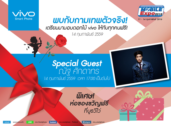 พร้อมทั้งพบกับแขกรับเชิญสุดพิเศษกับคุณ ณัฐ ศักดาทร ในวันที่ 14 กุมภาพันธ์ เวลา 17.00 น. เป็นต้นไป ท่านสามารถมาพบเราได้ที่บูธกิจกรรม vivo ในงาน Thailand Mobile Expo 2015 Zone Plenary Hall ตั้งแต่วันที่ 11-14 กุมภาพันธ์ 2559 เวลา 10.00 - 20.00 น. ณ ศูนย์การประชุมแห่งชาติสิริกิตติ์