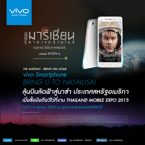 vivo Smartphone ร่วมกับภาพยนตร์ THE MARTIAN เฟ้นหาลูกค้าผู้โชคดีที่จะได้โอกาสพิเศษร่วมสัมผัสประสบการณ์ฝึกเป็นนักบินอวกาศ ณ ศูนย์อวกาศของ NASA ภายในงาน Thailand Mobile Expo 2015 พร้อมลุ้นรับบัตรชมภาพยนตร์ THE MARTIAN และของรางวัลอื่นๆ อีกมากมายโดยมีกติการ่วมสนุก ดังนี้
