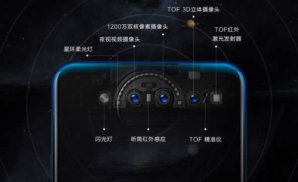 สำหรับกล้องถ่ายรูปด้านหลังนั้น เป็นกล้อง 3 ตัว (Triple-Camera) ประกอบด้วย กล้องหลัก ความละเอียด 12 ล้านพิกเซล (รูรับแสง F/1.9), กล้องตัวที่สอง (Depth) ความละเอียด 2 ล้านพิกเซล (รูรับแสง F/1.8) และกล้องตัวที่สาม (Time of Flight : ToF) สำหรับตรวจจับระยะชัดลึก และใช้สำหรับสแกนใบหน้าเพื่อปลดล็อกหน้าจอ (สแกนด้านหลัง) แต่ถ้าหากจะปลดล็อกที่หน้าจอหลัก จะเป็นการปลดล็อกแบบสแกนลายนิ้วมือใต้จอ