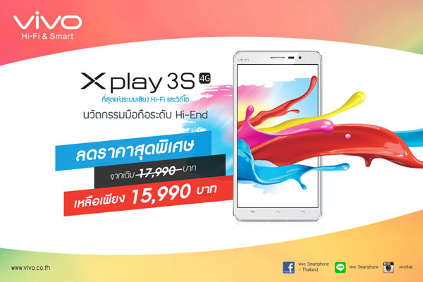 vivo Smartphone ให้สัมผัสความแรงจากสมาร์ทโฟนหน้าจอ 6 นิ้วไม่ว่าจะเป็นความแรงจากหน่วยประมวลผล Qualcomm Snapdragon 801 แบบ Quad-Core Processor ความเร็ว 2.3GHz, RAM 3GB ให้ vivo Xplay3S ใช้งานได้อย่างลื่นไหลในทุกฟังก์ชั่น หน้าจอ 6 นิ้วความละเอียดระดับ 2K ให้การแสดงผลที่คมชัด เก็บภาพได้ทุกรายละเอียดผ่านกล้องหลัง 13 ล้านพิกเซล, กล้องหน้า 5 ล้านพิกเซล, รองรับระบบเชื่อมต่อ 3G/4G ได้ทุกเครือข่าย สามารถดูรายละเอียดเพิ่มเติมของ vivo Xplay3S ได้ผ่าน https://www.vivo.co.th/xplay3s.php