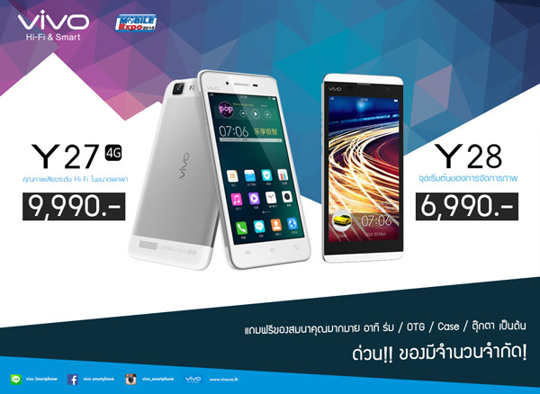 vivo Y27 สมาร์ทโฟนที่มีความบางเพียง 6.99 มม. มาพร้อมหน้าจอ IPS LCD ขนาด 4.7 นิ้ว ระบบประมวลผล Quad-Core 1.2 GHz พร้อมระบบเสียงสุดล้ำ Hi-Fi รุ่น AK4375 กล้องหลังความละเอียด 8 ล้านพิกเซล กล้องหน้าความละเอียด 5 ล้านพิกเซล รองรับระบบ 2 ซิม พร้อมกับการใช้งาน 4G ทั้ง 2 ซิม ในราคา 9,990 บาท และ vivo Y28 สมาร์ทโฟนหน้าจอความละเอียด IPS ขนาด 4.7 นิ้ว มาพร้อมกับระบบปฏิบัติการ Android 4.2 หน่วยประมวลผล Quad-core 1.3 GHz กล้องหน้าความละเอียด 5 ล้านพิกเซล กล้องหลังความละเอียด 8 ล้านพิกเซล RAM 1 GB หน่วยความจำภายในเครื่อง 8 GB รองรับระบบ 2 ซิมพร้อมกับการใช้งาน 4G ทั้ง 2 ซิมในราคา 6,990 บาท