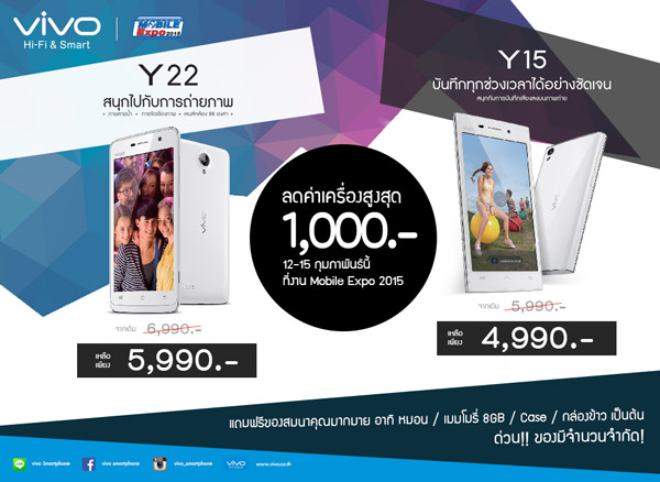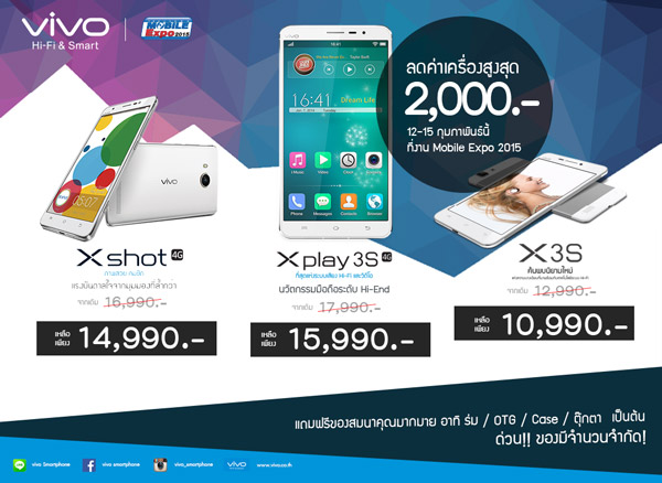 ปีนี้ในงาน Thailand Mobile Expo 2015 vivo จัดหนักสมาร์ทโฟนระดับคุณภาพให้คุณเลือกกันหลากรุ่นหลายสไตล์ พร้อมกิจกรรมและโปรโมชั่นที่จัดภายในบูธมากมาย โดยมีไฮไลท์และสมาร์ทโฟนรุ่นใหม่ๆ มากมายในงาน