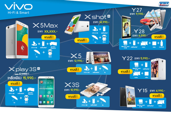 • vivo XPlay 3S สมาร์ทโฟนที่มาพร้อมความสามารถมากมายที่ไม่ธรรมดา เช่น หน้าจอความคมชัดระดับ 2K ขนาดหน้าจอ 6 นิ้ว หน่วยประมวลผล Snapdragon 801 กล้องหลังความละเอียด 13 ล้านพิกเซล กล้องหน้า 5 ล้านพร้อมแฟลช และระบบสแกนลายนิ้วมือ ในราคาเพียง 15,990 บาท