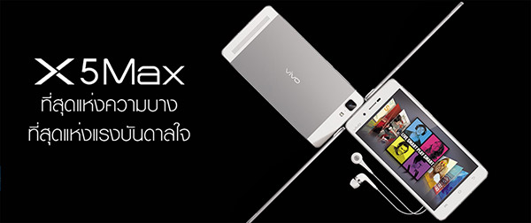 เริ่มจาก vivo X5Max สมาร์ทโฟนสุดบางด้วยสไตล์สุดล้ำ ที่มาพร้อมช่องหูฟัง 3.5 มิลลิเมตร ให้คุณได้ดื่มด่ำกับคุณภาพเสียงชั้นยอดจากหูฟังหลากรูปแบบ พร้อมเพิ่มอรรถรสในการฟังเพลงด้วยชิปเสียง DAC ES9018 ที่ให้เสียงได้ระดับเครื่องเล่นเพลงชั้นนำระดับโลก รับชมคมชัดกับหน้าจอระดับ SUPER AMOLED ขนาด 5.5 นิ้ว ที่มีความละเอียดสูงถึง 1080p พร้อมได้ติดตั้ง CPU Qualcomm Snapdragon 615 Octa-core 1.5GHz 64-bit/RAM 2GB และ GPU Adreno 405 คุณภาพสูง ให้การใช้งานที่รวดเร็วลื่นไหล รองรับ 2 ซิม เพื่อการใช้งานได้ทุกขณะ จึงได้ออกแบบให้รองรับการใช้งานอินเทอร์เน็ตในระบบ 4G ได้ทั้ง 2 ซิม พร้อมการใช้งานที่หลากหลายขึ้นโดยการใส่ไมโครซิมในช่องซิมหลัก และเลือกใส่ TF card หรือนาโนซิมในช่องซิมรองได้ตามการใช้งานของคุณ และกล้องหลังความละเอียด 13 ล้านพิกเซล กล้องหน้าความละเอียด 5 ล้านพิกเซล ซึ่ง vivo X5Max พร้อมให้คุณสัมผัสในงาน Thailand Mobile Expo เป็นที่แรกอีกด้วย