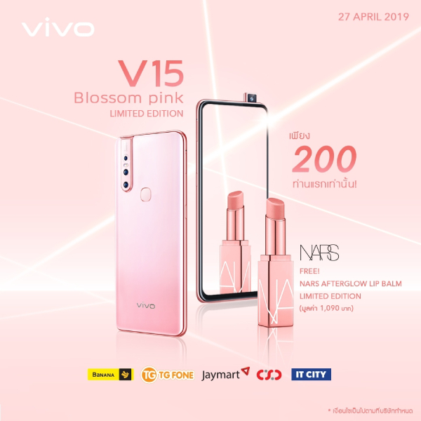 Vivo จัดสีใหม่ล่าสุดอย่าง Vivo V15 สี Blossom Pink Limited Edition เพื่อเพิ่มความสดใสให้กับทุกคนในหน้าร้อนนี้ โดยจะเริ่มวางจำหน่ายอย่างเป็นทางการในวันที่ 27 เมษายน 2562 ณ Vivo Brand shop , Banana , Jaymart , TG Fone , CSC , IT City ทั่วประเทศ สิทธิพิเศษสำหรับท่านใดที่ซื้อ Vivo V15 สี Blossom Pink Limited Edition ใน 200 ท่านแรก รับไปเลย ลิปสติก จากแบรนด์ NARS รุ่น Afterglow Lip Balm Limited Edition มูลค่า 1,090 บาท และสำหรับหน้าร้าน AIS , True , Dtac Vivo V15 สี Blossom Pink Limited Edition จะสามารถซื้อได้ใน วันที่ 5 พฤษภาคม 2562 เป็นต้นไป Vivo V15 วางจำหน่ายในราคา 10,999 บาท โดยมีให้เลือกถึง 3 สีด้วยกัน ได้แก่ Topaz Blue ( สีน้ำเงิน ) และ Glamour Red ( สีแดง ) Blossom Pink Limited Edition (สีชมพู)