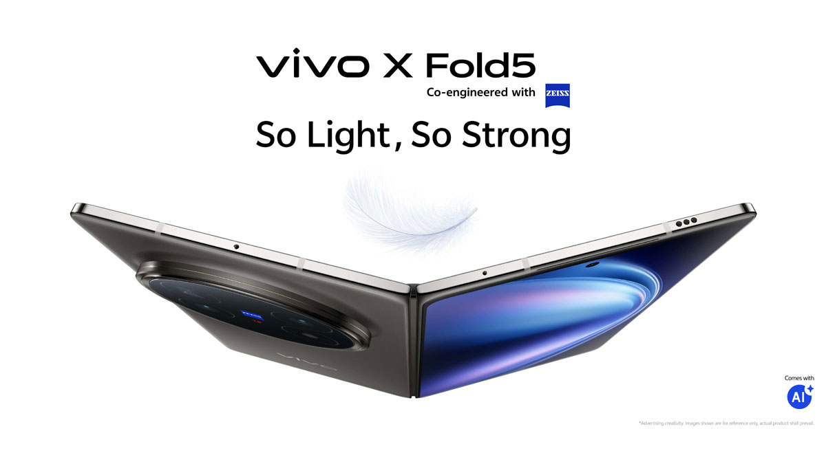 vivo ประกาศวางจำหน่ายสมาร์ตโฟนจอพับครั้งแรกในไทยอย่างเป็นทางการภายใต้คอนเซ็ปต์ “So Light, So Strong” กับ vivo X Fold5 ที่ผสานนวัตกรรมระดับเรือธงเข้ากับงานดีไซน์สุดพรีเมียม ทั้งบาง เบา และทนทานยกระดับประสบการณ์การใช้งานสู่อนาคต ด้วยวัสดุคุณภาพสูงและเทคโนโลยีบานพับ Armor Architecture 2 รองรับการพับ-กางได้มากถึง 600,000 ครั้ง โดดเด่นด้วยแบตเตอรี่ความจุสูงถึง 6000mAh จอแสดงผลหลักขนาดใหญ่ 8.03 นิ้ว เมื่อกางใช้งาน ผสานกล้องระดับมืออาชีพที่ร่วมพัฒนากับ ZEISS รองรับการถ่ายภาพในทุกระยะการซูม พร้อมด้วยฟีเจอร์ AI อัจฉริยะที่ยกระดับประสิทธิภาพการทำงานให้ลื่นไหลและทรงพลังยิ่งขึ้น วางจำหน่ายแล้ววันนี้ในราคา 59,999 บาท
