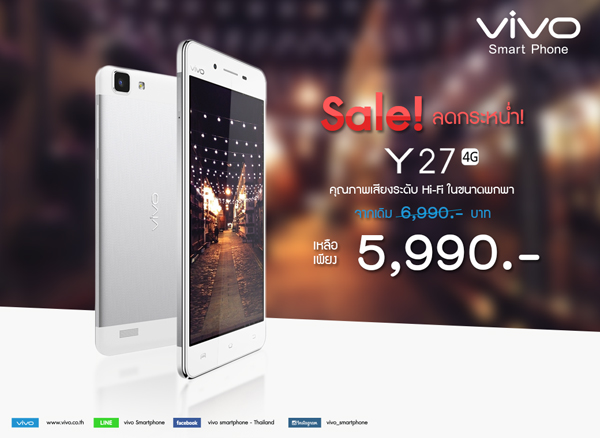 vivo Y27 สมาร์ทโฟนสุดคุ้ม ที่ออกแบบได้เรียบหรู ใช้งานได้ง่ายเหมาะกับทุกๆ คนในบ้าน มีหน้าจอแสดงผลขนาด HD ความละเอียด 4.7 นิ้วหน่วยประมวลผลแบบ Qualcomm Snapdragon 410 Quad-core 1.2GHz ระบบ 64 bit พร้อมหน่วยความจำ RAM 1GB / ROM 8GB เพิ่มหน่วยความจำ Micro SD ได้สูงสุด 128 GB รองรับทุกแอพได้ลื่นไหล สนุกสนานไปกับดีไซน์สดใสบนอินเตอร์เฟสแบบ Funtouch OS พร้อมแอพพลิเคชั่นมากมายบน Google Play Store กล้องถ่ายภาพระดับคุณภาพทั้งกล้องหน้า 5 ล้านพิกเซลและกล้องหลัก 8 ล้านพิกเซลโดย vivo Y27 จะปรับราคาจาก 6,990 บาท เหลือเพียง 5,990 บาท