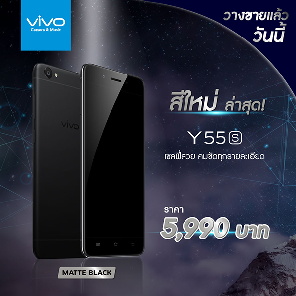 ใครที่กำลังสนใจมือถือสามาร์ทโฟนสุดคุ้มอย่าง Vivo Y55s จากที่เคยวางขายไปแล้วก่อนหน้านี้ซึ่งมี สีทอง (Gold) และโรสโกล (Rose Gold) ในวันนี้เปิดตัวสีดำ (Mette Black) ให้ความรู้สึกหรูหรามากยิ่งขึ้น โดย Vivo Y55s มาพร้อมกับ Funtouch OS 3.0 ครอบทับแอนดรอยด์เวอร์ชั่น 6.0 หน้าจอขนาดกว้าง 5.2 นิ้ว ความละเอียด 720p มีโหมดถนอมสายตา กล้องหน้าความละเอียด 5 ล้านพิกเซล f2.0 กล้องหลังความละเอียด 13 ล้านพิกเซล f2.2 สามารถใช้งานแบ่งหน้าจอได้ด้วยโหมด Smart Split 2.0 รองรับ 4G LTE โดยมี RAM 2 GB และ ROM 16 GB รองรับ microSD card รองรับความจุสูงสุด 256GB ในราคาเพียง 5,990 บาท