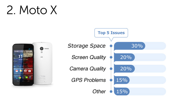 ถัดมาเป็น Motorola Moto X ครับ โดยผู้ใช้ 30% ไม่ชอบเรื่องความจุในตัวเครื่องที่มีให้น้อยเกินไป จริงอยู่ที่คุณสมบัติของ Motorola Moto X ความจุของตัวเครื่องอยู่ที่ 16 GB แต่เหลือพื้นที่ใช้งานจริงแค่ 12 GB นอกจากนี้ Moto X ยังไม่รองรับ microSD card ส่วนอีก 20% ไม่ชอบเรื่องความละเอียดของหน้าจอ ที่ให้มาเพียง 720 x 1280 พิกเซลเท่านั้น
