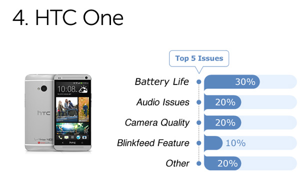สุดท้าย เป็น HTC One กันบ้าง โดยผู้ใช้กว่า 30% บ่นเรื่องแบตเตอรี่ครับ ทั้งแบตเตอรี่ไม่อึด ชาร์จช้า และเปลี่ยนเป็นแบตเตอรี่สำรองไม่ได้ ส่วนอีก 20% บ่นเรื่องปัญหาด้านการใช้งานต่างๆ เช่น มีเสียงซ่าขณะใช้งานโทรศัพท์ หรือฟังเพลง และอีก 20% ไม่ชอบเรื่องกล้อง UltraPixel ครับ