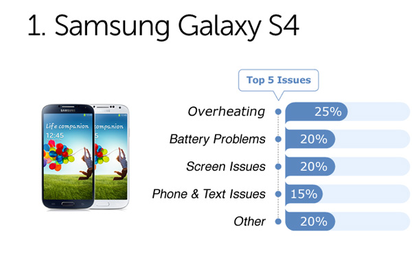 ผู้ใช้ Samsung Galaxy S4 กว่า 25% บ่นถึงปัญหาเรื่องตัวเครื่องร้อน ขณะเล่นเกม และเปิดเว็บไซต์ในเวลาเดียวกัน ส่วนปัญหาอื่นๆ ก็อย่างเช่น แบตเตอรี่หมดเร็วเกินไป ต้องใช้เวลาชาร์จบ่อย, การแสดงผลของหน้าจอ สลัวกว่ามือถือที่ใช้กระจกหน้าจอแบบ Glass ซึ่งมีผลต่อการอ่านข้อความบนมือถือ เป็นต้น