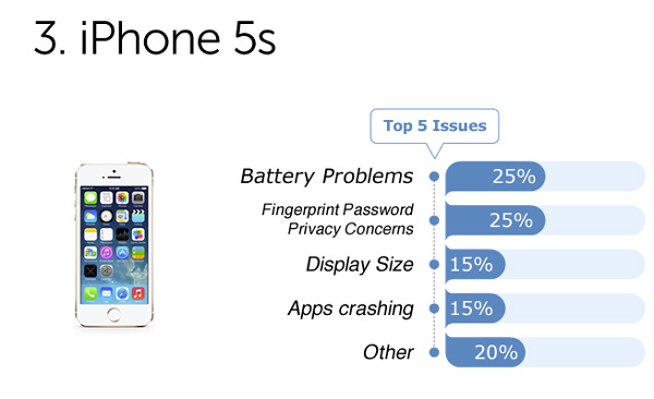 มาถึงสมาร์ทโฟนเรือธงอย่าง iPhone 5S กันบ้างครับ โดยผู้ใช้ 25% กั่งวลเรื่องความปลอดภัยของ Touch ID ระบบสแกนลายนิ้วมือ ส่วนอีก 25% ไม่ชอบเรื่องแบตฯ ไม่อึด และอีก 15% บ่นเรื่องแอพฯ ค้างบ่อย