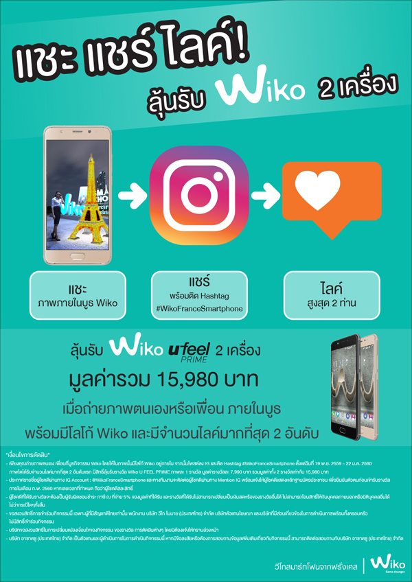Wiko (วีโก) สมาร์ทโฟนจากฝรั่งเศส จัดกิจกรรมพิเศษส่งท้ายปี “แชะ แชร์ ไลค์!” เพียงถ่ายภาพตนเองหรือเพื่อนที่บูธกิจกรรมวีโก และในภาพต้องมีโลโก้ Wiko ด้วย บริเวณศูนย์การค้าเอเชียทีค เดอะ ริเวอร์ฟร้อนท์ แล้วโพสต์ลง IG พร้อมติด Hashtag #WikoFranceSmartphone ตั้งแต่วันนี้ถึง 22 ม.ค. 2560 ภาพใดได้รับจำนวนไลค์มากที่สุด 2 อันดับแรก ลุ้นรับฟรีสมาร์ทโฟนที่ครบครันด้วยสุดยอดเทคโนโลยี Wiko U FEEL PRIME จำนวน 1 เครื่อง รวม 2 รางวัล มูลค่ารวม 15,980 บาท หลังสิ้นสุดกิจกรรม ทางทีมงานจะประกาศรายชื่อผู้โชคดีที่ IG “WikoFranceSmartphone”
