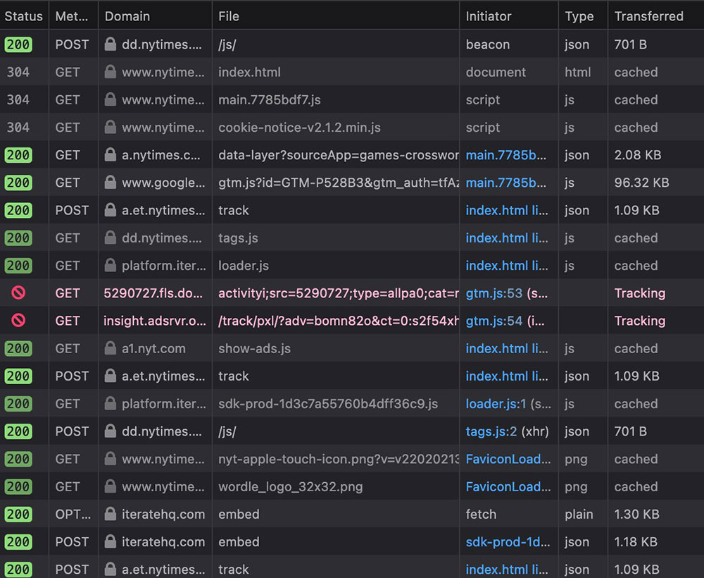 สำหรับ ad tracker ที่ฝังอยู่ใน Wordle นั้น ยังไม่ยืนยันว่า เป็นโค้ดที่ผู้พัฒนา Wordle ฝังไว้อยู่แล้ว หรือว่าทาง The New York Times ฝังเพิ่มเข้ามา แต่จากข้อมูลที่ทาง Gizmodo เผยนั้นพบว่า มีการเก็บข้อมูลของผู้ใช้อย่างเช่น เล่นเกมผ่านอุปกรณ์อะไร หรือเล่นเกมในช่วงเวลาไหน ซึ่งข้อมูลเหล่านี้จะถูกส่งไปให้ Google และทาง Google ก็จะนำข้อมูลนี้ไปวิเคราะห์ก่อนจะยิงโฆษณาที่ผู้เล่นแต่ละคนสนใจกลับมา