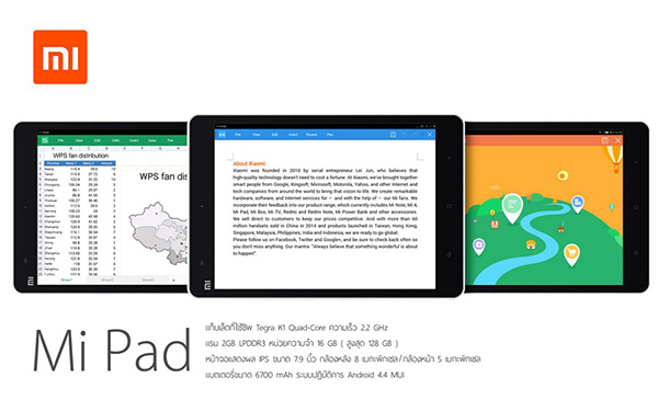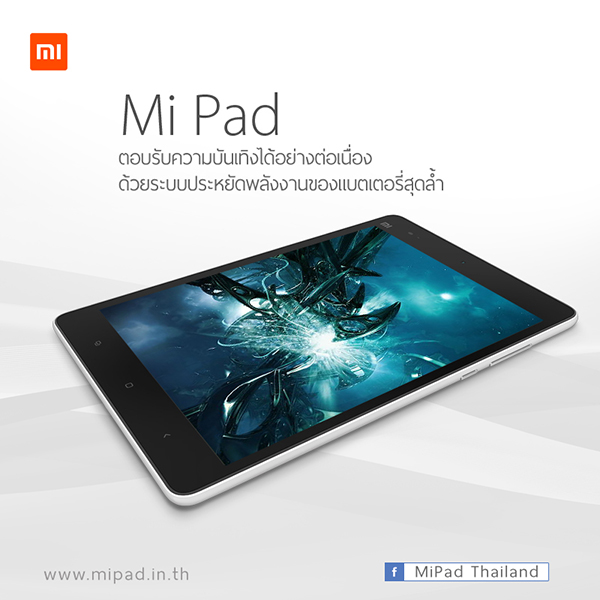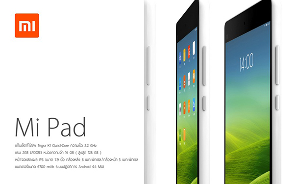 หากจะพูดถึงสมาร์ทโฟนหรือแท็บเล็ตจากแบรนด์ที่ฟังก์ชั่นครบและราคาไม่แพงคุ้มค่าตอบโจทย์ทุกไลฟ์สไตล์ Xiaomi (เสี่ยวหมี่) เป็นอีกหนึ่งแบรนด์ที่มาแรง มักจะจัดเต็มทุกฟังก์ชั่นความแรงของเครื่อง ที่สำคัญคือราคาถูก เข้าถึงได้ไม่ยากและวันนี้เราจะพาไปดูอีกหนึ่งผลิตภัณฑ์ใหม่ของแบรนด์นี้นั่นคือ Xiaomi Mi Pad แท็บเล็ต 7.9 นิ้ว ตัวแรกของโลกที่ใช้ชิปเซ็ต CPU ตัวแรงเวอร์จาก Nvidia ซึ่งตอนนี้มีขายออนไลน์อย่างเป็นทางการในไทยแล้วที่ www.mipad.in.th ตัวเครื่องมาพร้อมฟังก์ชั่นภาษาไทย และใบรับประกัน 1 ปีเต็ม ชูจุดเด่นที่สเปคเร็ว และแรง แต่ราคาเบาๆ คุ้มค่าแน่นอน เพิ่มความมั่นใจด้วยศูนย์บริการรับซ่อมในไทย หมดกังวลเรื่องเครื่องหิ้วที่ไม่ได้คุณภาพ