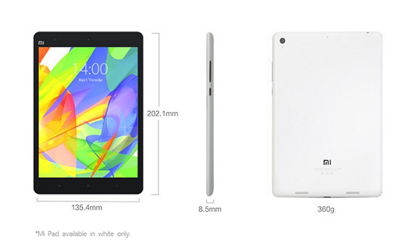 Xiaomi Mi Pad มาพร้อมหน้าจอ 7.9 นิ้ว ความละเอียด 2048 x 1536 พิกเซล 324 ppi เสริมความแข็งแรงของหน้าจอด้วย Corning Gorilla Glass 3 ส่วนขนาดของตัวเครื่องอยู่ที่ 202.1 x 135.4 x 8.5 มิลลิเมตร ตัวเครื่องสีขาว ฝาหลังผลิตจากวัสดุพลาสติกมันวาว น้ำหนักเบา ดีไซน์เรียบหรู พกพาสะดวก ปุ่มกดต่างๆ ออกแบบมาให้ใช้งานได้ง่าย ไม่ยุ่งยาก
