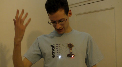 กระทาชายนายหนึ่งชื่อว่า คริส เค้าได้ออกแบบเสื้อยืดที่ฝังอุปกรณ์ที่จะแจ้งเตือนเมื่อมีเมล์มา ได้ทันทีจะมีไฟล์กระพริบบนเสื้อ เรียกได้ว่า กระพริบบนยอดอกกันเลยทีเดียว ไม่ใช่แค่แจ้งเตือนนะครับ มันยังระบุได้ด้วยว่ามีเมล์ค้างใน inbox กี่เมล์ เห็นภาพครั้งแรก ผมคิดถึง ไอออนแมน ยังไงชอบกล :)