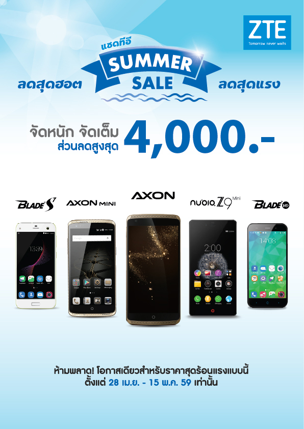 ส่งต่อความสุขด้วยโปรโมชั่นสุดฮ็อตรับหน้าร้อนด้วยส่วนลดจุใจแบบนี้ ระหว่างวันที่ 28 เมษายน – 15 พฤษภาคม 2559 นี้เท่านั้น สามารถเข้าไปหาซื้อและสอบถามรายละเอียดได้ที่ตัวแทนจำหน่าย ของ ZTE หรือติดตามความเคลื่อนไหว และกิจกรรมสนุกๆ ผ่านเวบไซต์ www.zte.co.th และเฟซบุ๊ค www.facebook.com/ztethailand
